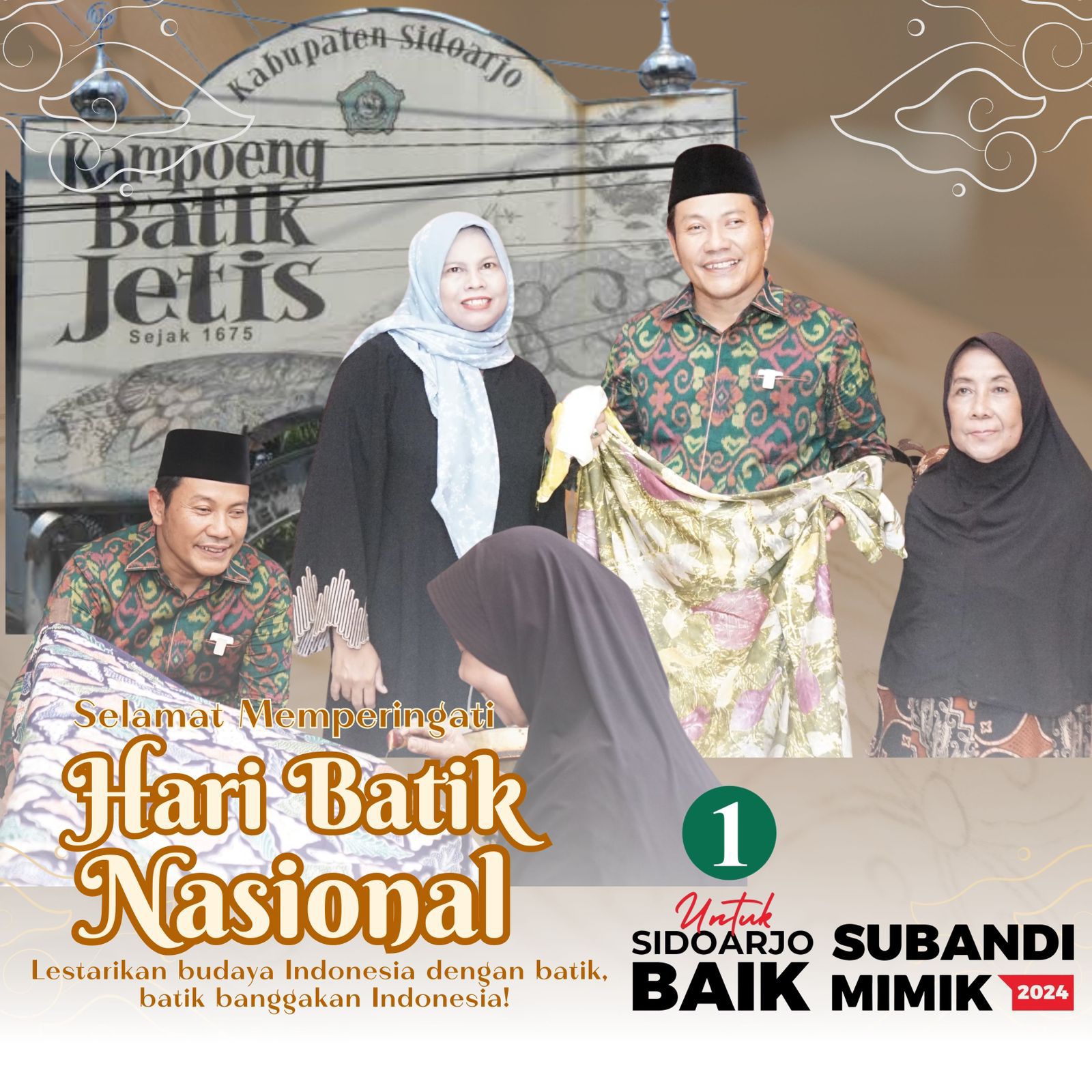 Momentum peringatan Hari Batik Nasional dimanfaatkan oleh calon Bupati Sidoarjo Subandi untuk berkunjung ke kawasan Kampung Batik Jetis di Kelurahan Lemahputro, Sidoarjo, Rabu (2/10/2024).