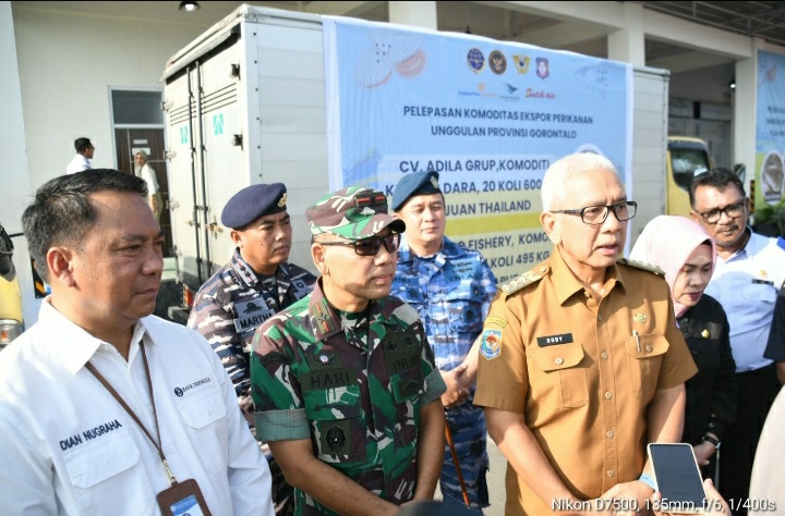 Acara pelepasan komoditas ekspor perikanan unggulan Provinsi Gorontalo turut dihadiri oleh PJ. Gubernur Gorontalo Dr. Ir. Mohammad Rudy Salahuddin, MEM., Dandim 1315/KG Letkol Arm Yudi Ari Irawan, S. Sos. M. Han., Dansatradar 224/Kwd Letkol lek Riki Husman M.Han., Danlanal Gorontalo Letkol Laut (P) Martha Novalianto S.H., M.Tr.Opsla., Kepala Kantor BNI Gorontalo Dian Nugraha, Kasie teknik dan oprasi Bandara Djalaludin Gorontalo Sayyid Segaf Algadri, Kasi Intel Kejaksaan Negeri Kabupaten Gorontalo Harry Arfhan, SH., MH., Kapolsek Bandara Djalaludin Gorontalo Iptu Ismet Ishak, Dir CV Berkat Adidaya, Dir UD Faris, Dir CV Adila dan Dir CV Gorontalo Fishery.