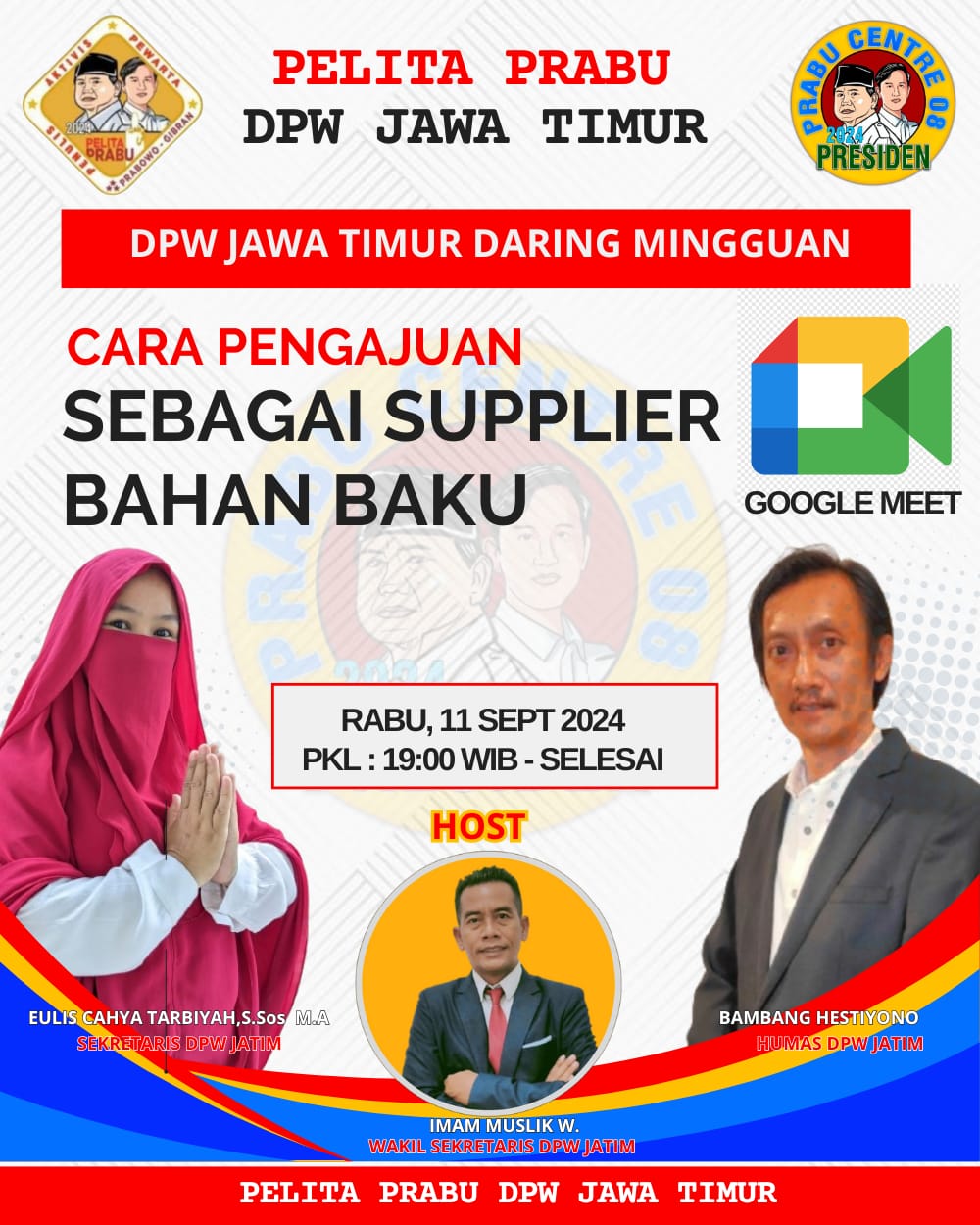 Sebagai narasumber, Sekretaris DPW Pelita Prabu Jawa Timur, Eulis Cahya Tarbiyah, S. Sos., M.A. Ia fokus membahas terkait persyaratan dokumen administrasi calon supplier DPW Pelita Prabu Jawa Timur. Mulai dari kelengkapan administrasi perusahaan maupun struktur organisasi DPC, DPK, hingga DPRt.