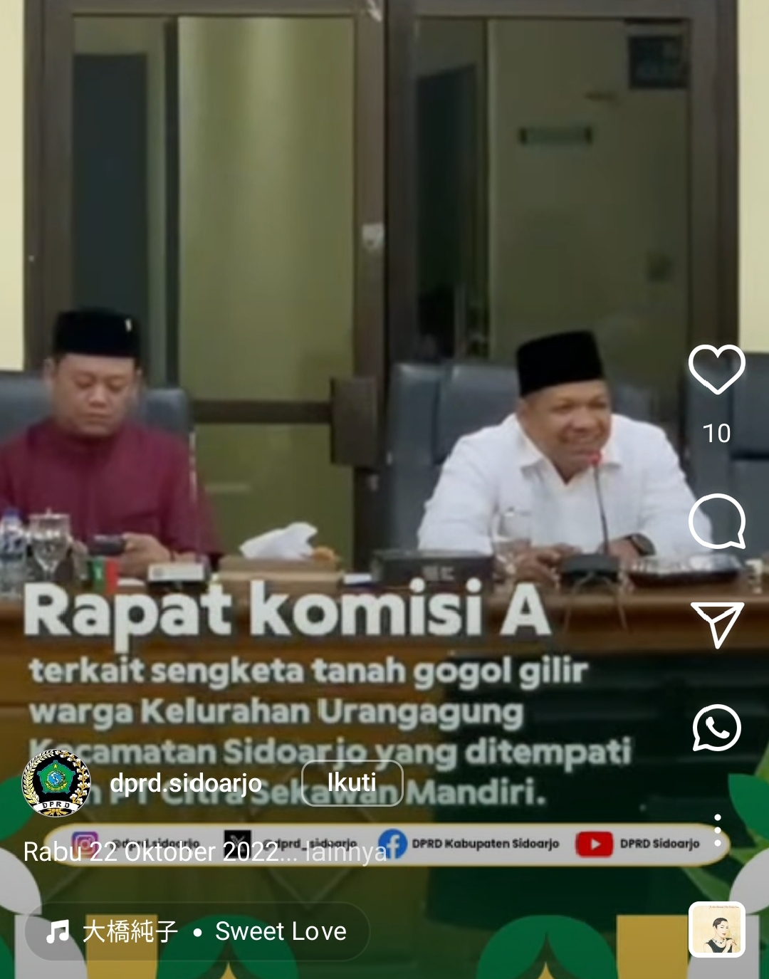 Selesai sudah hearing sengketa tanah petani Urangagung Sidoarjo. Mediasi di ruang rapat Komisi A DPRD Kabupaten Sidoarjo. Agenda siang hari tersebut menyisakan rekomendasi untuk mencari kata sepakat antara pihak PT Citra Sekawan Mandiri dengan pihak tiga petani gogol gilir yang tanahnya sudah dimanfaatkan untuk kepentingan perumahan. (22/10/2025).