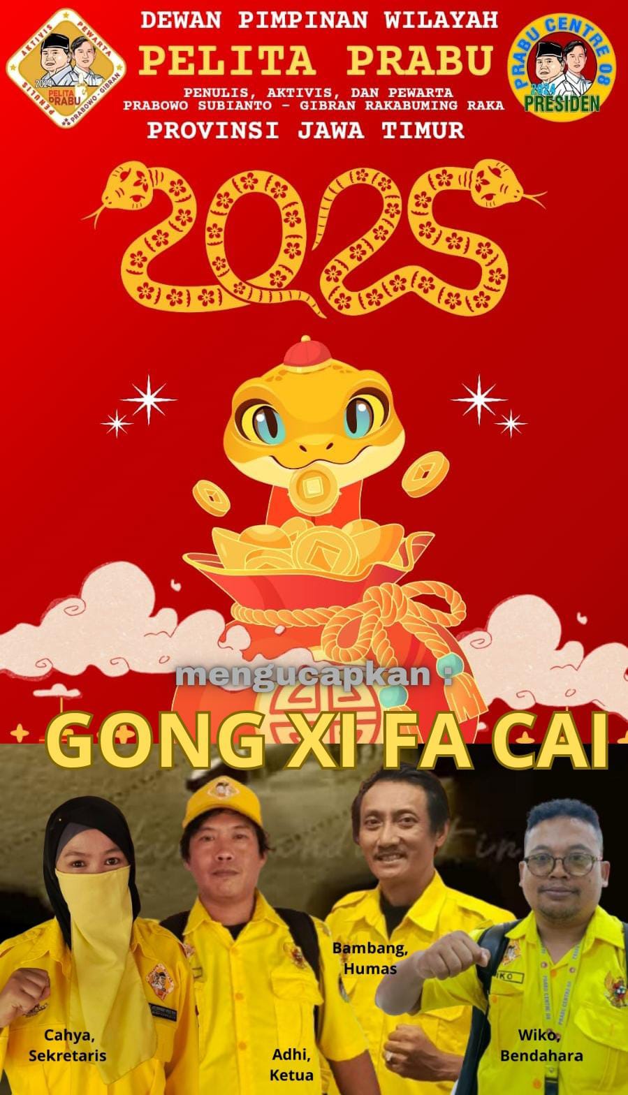 “Kami semua berharap dalam Imlek kali ini juga merupakan doa terbaik bagi kepemimpinan Prabowo – Gibran menuju cita-cita Indonesia Emas,” imbuh Eulis Cahya Tarbiyah, M.A, perempuan bercadar yang juga menjabat sekretaris wilayah organ relawan Prabowo – Gibran ini.