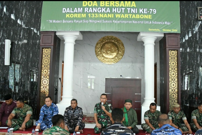 Dalam rangka Hari Ulang Tahun (HUT) Tentara Nasional Indonesia (TNI) yang ke-79 tahun 2024, bersama Tri Matra TNI di Gorontalo menggelar doa bersama yang bertempat di Masjid Permata Makorem 133/Nani Wartabone Kamis (03/09/2024).