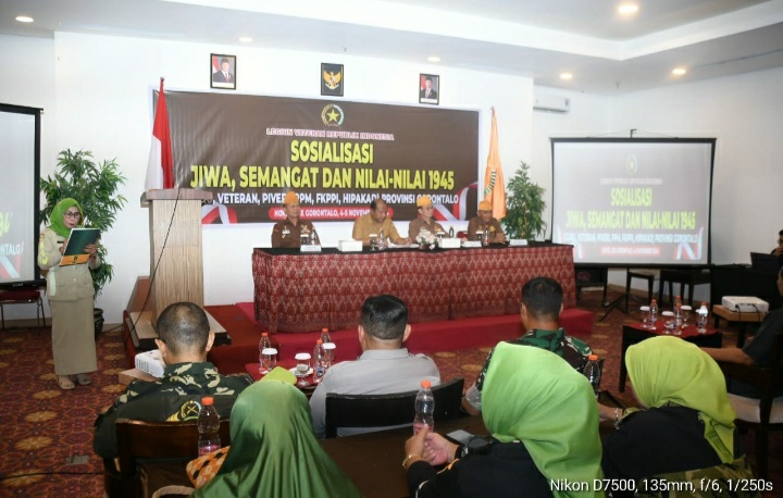 Danrem 133/Nani Wartabone Brigjen TNI Hari Pahlawantoro, S.Sos., diwakili Kasipers Kasrem 133/NW Kolonel Arh Louis Ferdinand P., S.T., menghadiri acara Sosialisasi Jiwa Semangat dan Nilai-Nilai Juang 1945 bertempat di Ballroom Hotel Fox, Jl Kasuari, Kel Heledulaa Selatan, Kec Kota Timur, Kota Gorontalo.