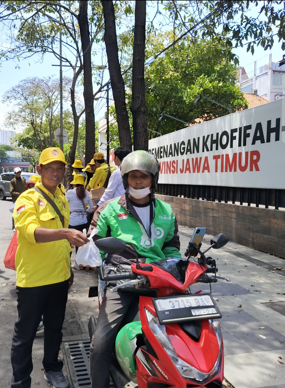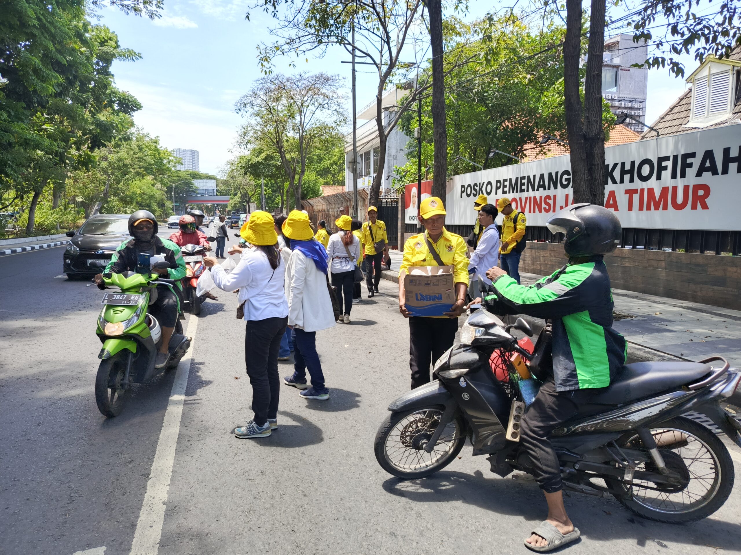Nampak di jalan Diponegoro berjejer aktifis relawan Pelita Prabu Jawa Timur. Situasinya didominasi kostum kuning sebagai seragam resmi mereka. Mereka antusias membagikan makan siang untuk pemakai jalan yang kebetulan melintasi di jalan tersebut.