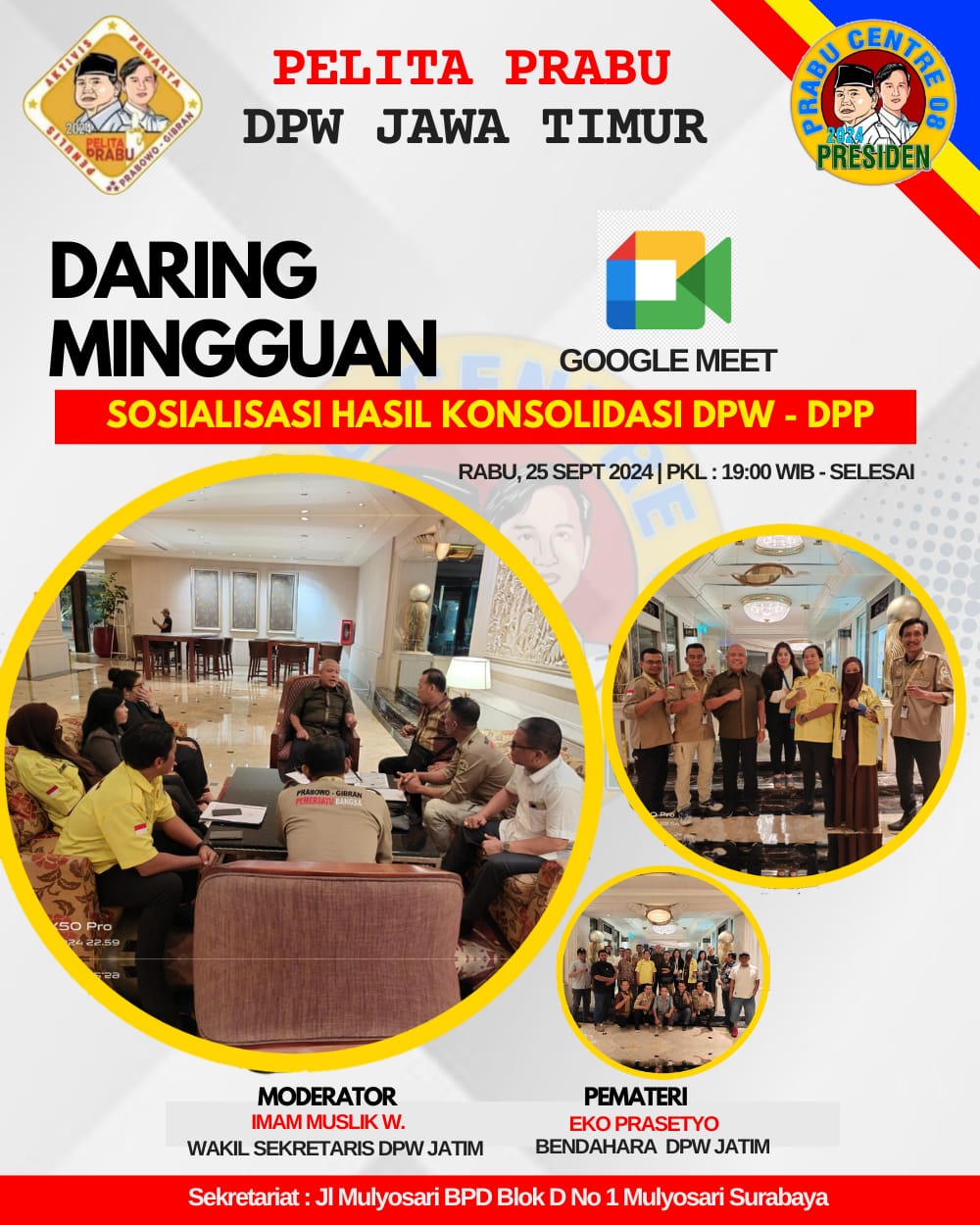 Daring rutin mingguan DPW Pelita Prabu Jawa Timur selesai digelar (25/09/2024). Agenda pembahasan mengenai sosialisasi hasil konsolidasi DPW ke DPP yang sudah dilakukan. Sosialisasi kedua mengenai pentingnya untuk segera audensi DPC/DPK ke kodim/Koramil