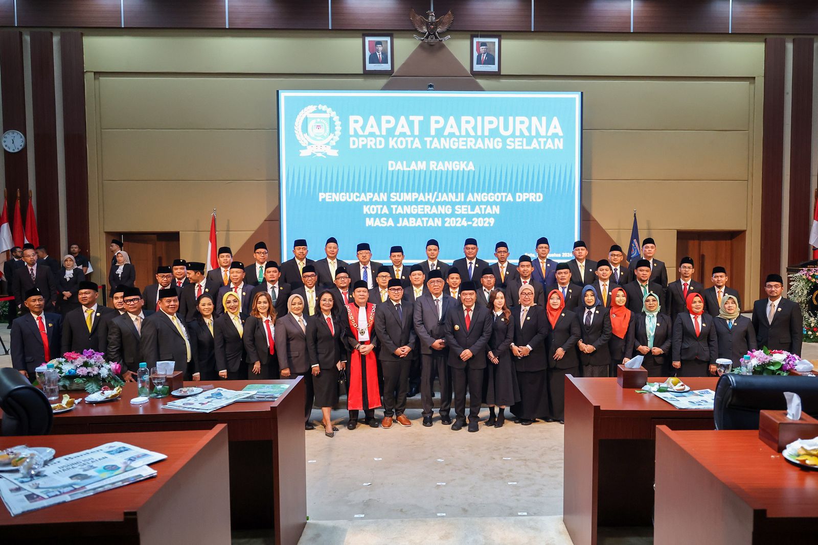 Sebagai informasi, sebanyak 50 anggota DPRD Kota Tangerang Selatan ucapkan sumpah/janji berdasarkan Surat Keputusan Gubernur Banten Nomor 271 Tahun 2024 tentang Peresmian Pemberhentian Anggota DPRD Kota Tangerang Selatan Masa Bakti 2019 – 2024 dan Peresmian Pengangkatan Anggota DPRD Kota Tangerang Selatan Masa Bakti 2024 – 2029. Pengucapan sumpah/janji dipandu oleh Ketua Pengadilan Negeri Kota Tangerang Selatan Fahmiron.***