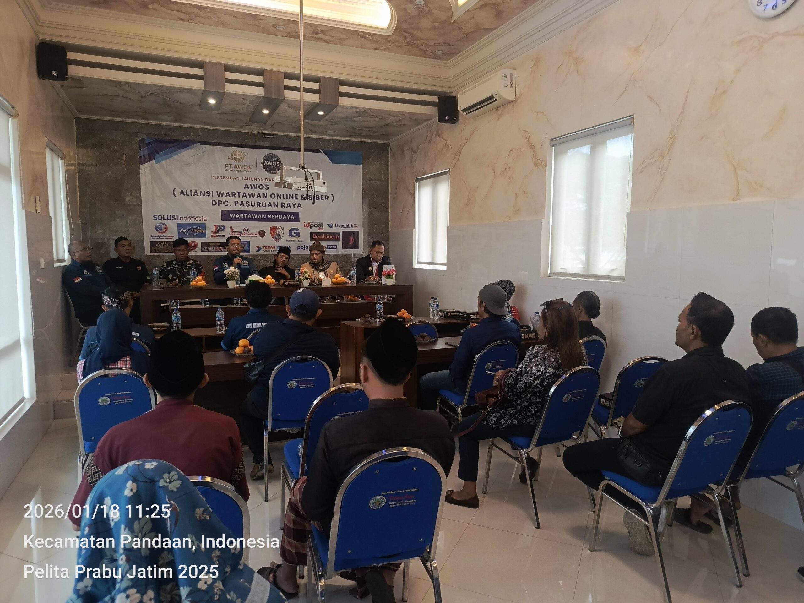 Pertemuan Tahunan Aliansi Wartawan Online dan Siber (AWOS) 2026 sukses digelar. Forum tersebut menegaskan arti penting dan eksistensi pers siber sebagai pilar penting demokrasi termasuk jika bicara pada tataran sosial politik lokal. Agenda tahunan ini dirangkai dengan peresmian Dewan Pimpinan Cabang (DPC) Pasuruan Raya dan digelar di kawasan Wisata Pemandian Telaga Sewu, Desa Klagen, Duren Sewu, Kecamatan Pandaan, Kabupaten Pasuruan, Minggu (18/01/2026).