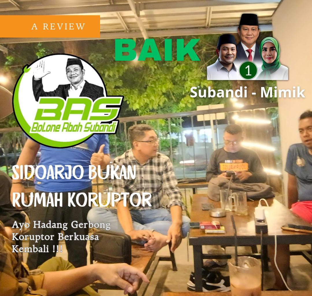 Dalam pertemuan Bolone Abah Subandi (BAS) di salah satu Kafe di Sidoarjo Kota muncul rekomendasi mendesak demi Kota Delta bersih dari anasir korupsi. Pertemuan tersebut dihadiri aktifis inti BAS untuk membangun isu bersama mengenai pentingnya menghadang gerbong koruptor yang ingin merebut tampuk kekuasaan kembali (18/11/2024)