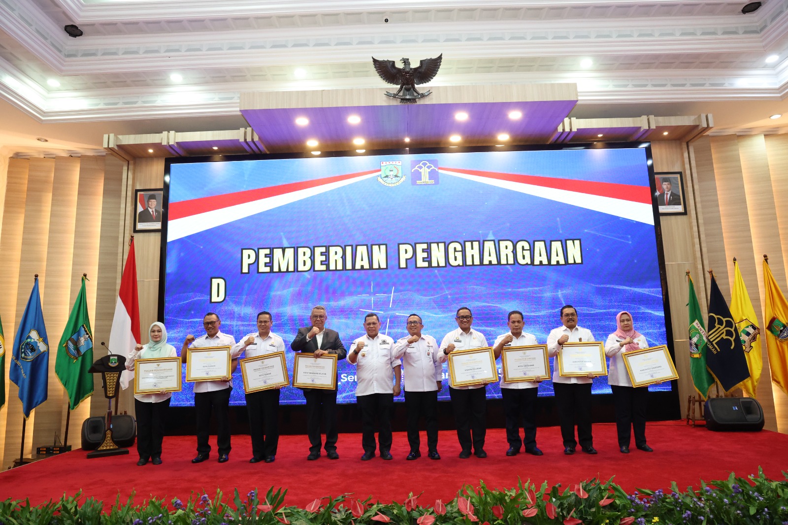 Penghargaan diserahkan oleh A Damenta bersama Kepala Kantor Wilayah (Kanwil) Kementerian Hukum dan Hak Asasi Manusia (HAM) Banten R. Natanegara Kartika Purnama, di Pendopo Gubernur Banten, KP3B, Curug Kota Serang, Rabu (8/1/2025).