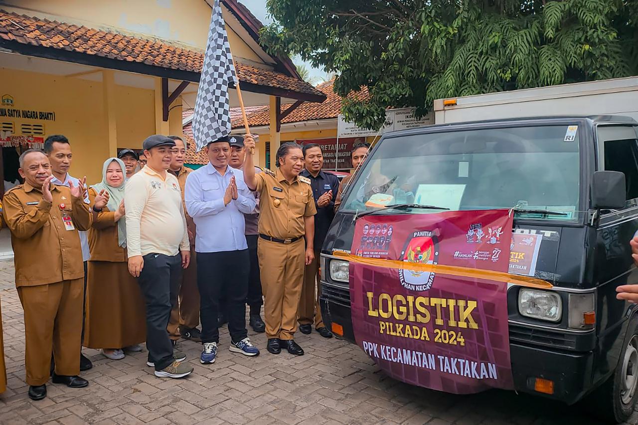 Penjabat (Pj) Gubernur Banten Al Muktabar melakukan pengecekan dan memastikan kelengkapan logistik pelaksanaan Pilkada Serentak 2024. Turut mendampingi, Ketua Komisi Pemilihan Umum (KPU) Provinsi Banten Mohamad Ihsan.