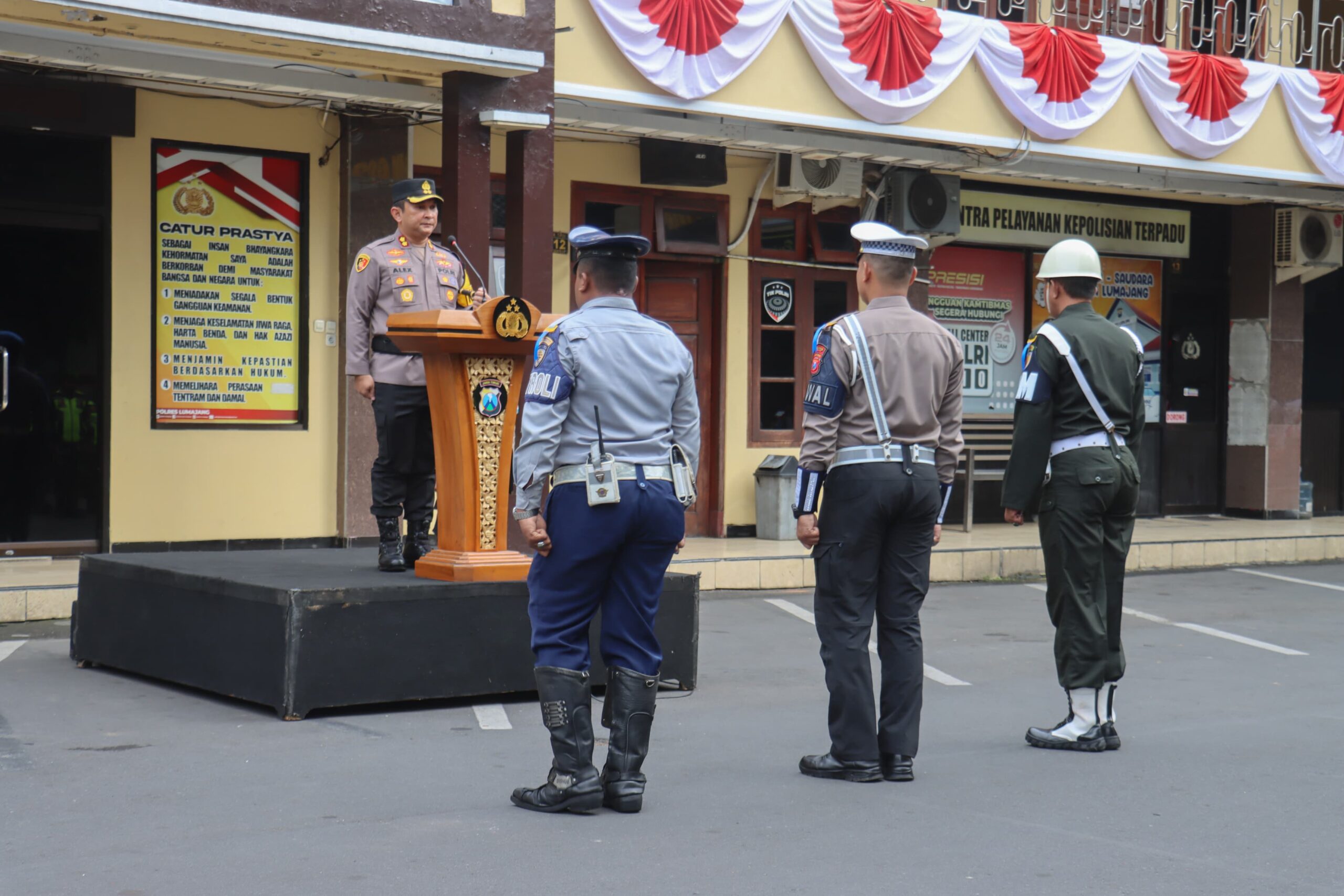 Apel tersebut dipimpin langsung oleh Kapolres Lumajang AKBP Alex Sandy Siregar, S.I.K, S.H, M.H dan diikuti oleh Wakapolres, para pejabat utama (PJU) Polres Lumajang, Kodim 0821, Dinas Perhubungan, Satpol PP, serta seluruh personel yang terlibat.