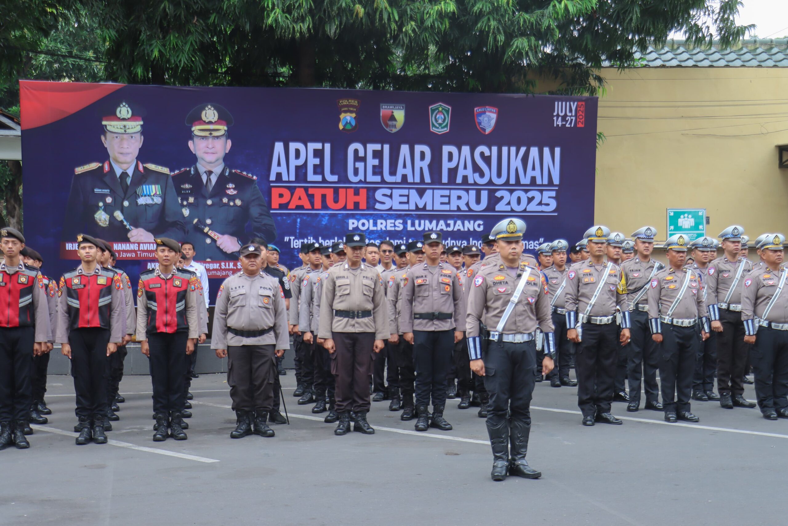 Polres Lumajang menggelar Apel Gelar Pasukan Operasi Kepolisian Kewilayahan Patuh Semeru 2025, Selasa pagi (14/07/2025), di halaman Mapolres Lumajang.