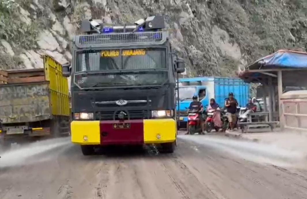 Polres Lumajang mengerahkan satu unit mobil Water Canon (AWC) untuk membantu membersihkan sisa material berupa lumpur dan abu vulkanik Awan Panas Guguran (APG) Gunung Semeru yang menumpuk di kawasan Jembatan Besuk Koboan Kecamatan Candipuro, Kamis (20/11/2025).