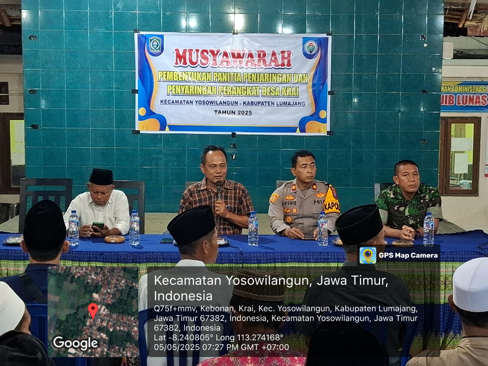 Kapolsek Yosowilangun Iptu Rusdiq Sudarmanto turut hadir dalam rapat pembentukan panitia penjaringan perangkat desa Krai untuk mengisi kekosongan jabatan Kaur Keuangan. Acara yang berlangsung di Balai Desa Krai, Kecamatan Yosowilangun, Kabupaten Lumajang pada Senin (5/5/2025).
