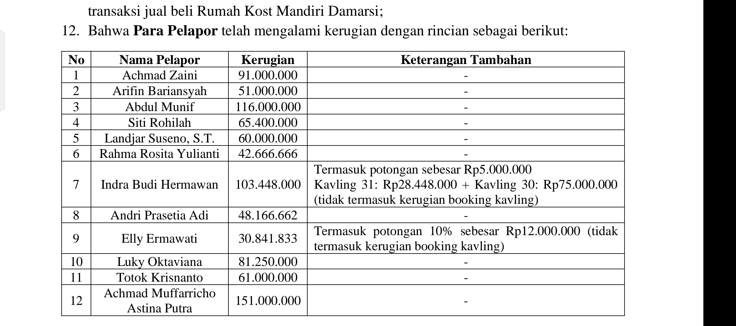 Menurut info yang telah dihimpun bahwa Agus Nasroni (nama pertama) selaku Komisaris PT Sampurna Indo Raya adalah residivis atas kasus serupa terkait proyek perumahan lain. Hal ini memperkuat keyakinan para korban bahwa mereka telah menjadi korban mafia tanah dalam transaksi bodong jual beli Rumah Kost Mandiri Damarsi.***