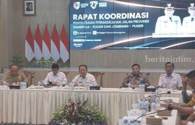 Bupati Jember Hendy Siswanto memimpin rapat koordinasi penyelesaian masalah jalan rusak milik Pemerintahan Provinsi di Kecamatan Rambipuji, Kecamatan Puger dan Kecamatan Jombang di Pendopo Kabupaten Jember Jawa Timur, Senin ( 13/1/3025 ) sore.