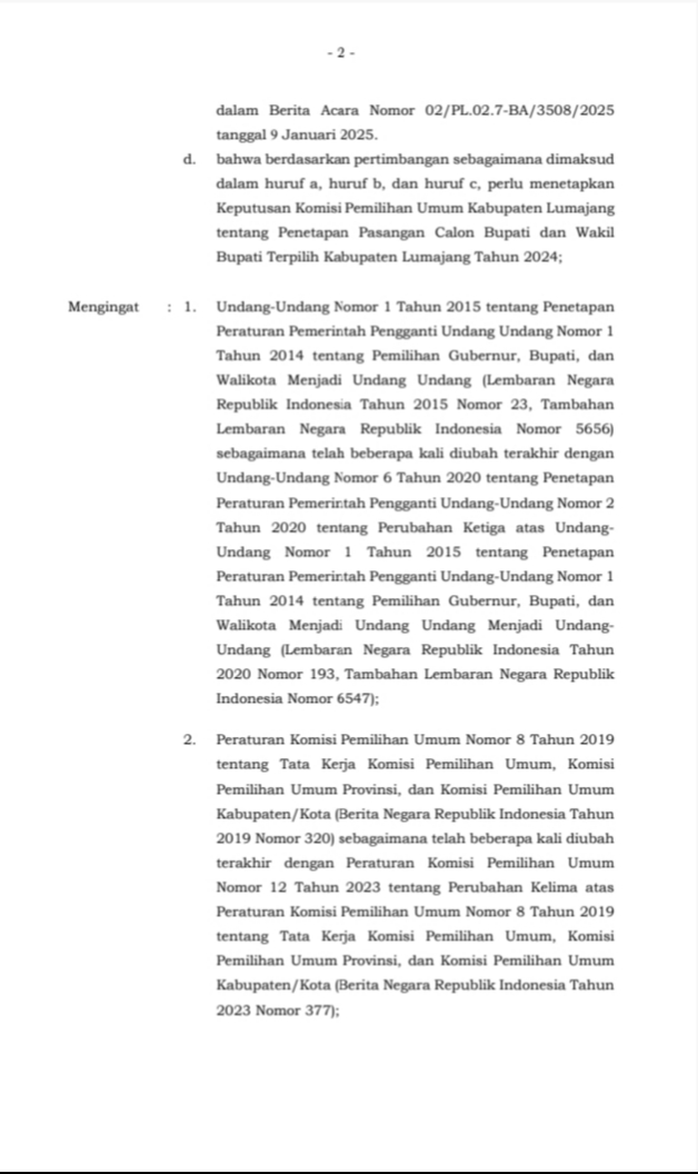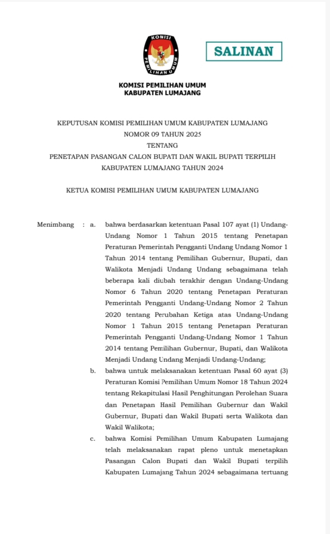 Rapat Pleno Terbuka Penetapan Pasangan calon Bupati dan Wakil Bupati Lumajang Terpilih Dalam Pemilihan Serentak Tahun 2024