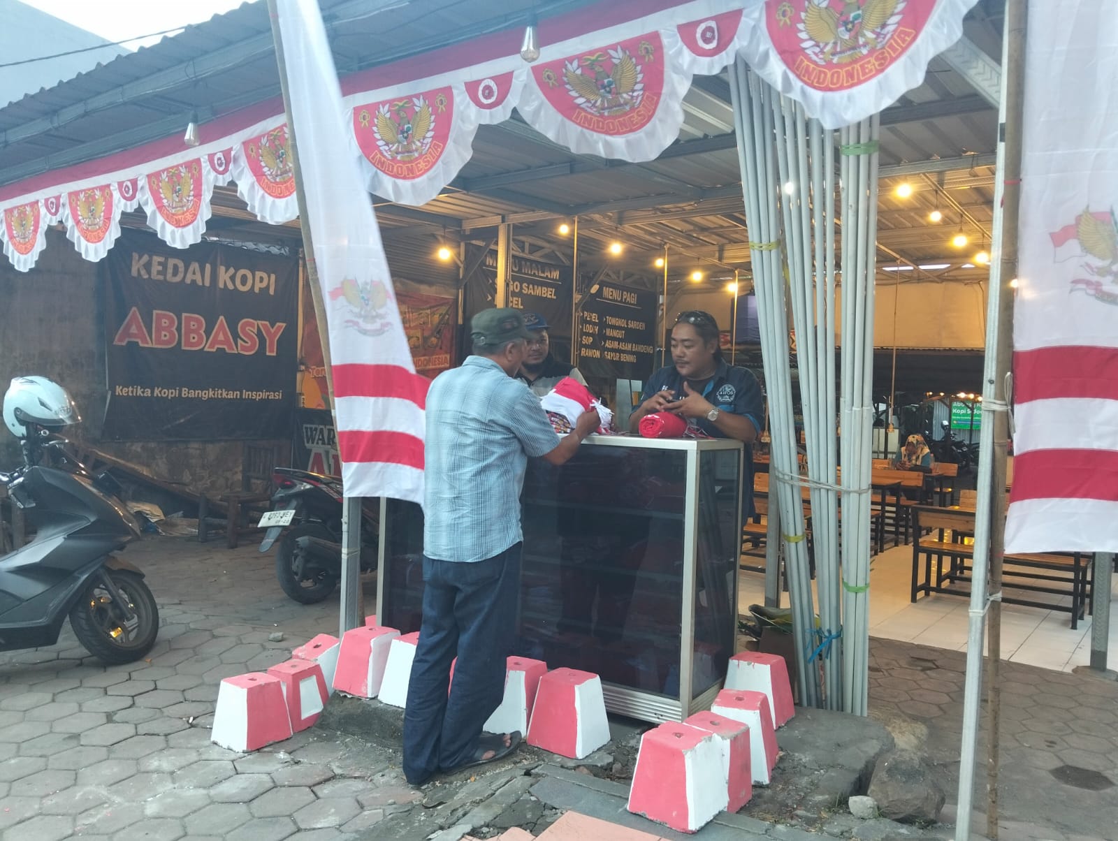 Gerai AWOS buka setiap hari mulai pukul 10.00 hingga 20.00 WIB. Nampak berbagai kebutuhan dekorasi agustusan, mulai dari bendera kain berbagai ukuran, umbul-umbul, background merah putih, bandir, hingga aksesoris hiasan gapura dan pita-pita.
