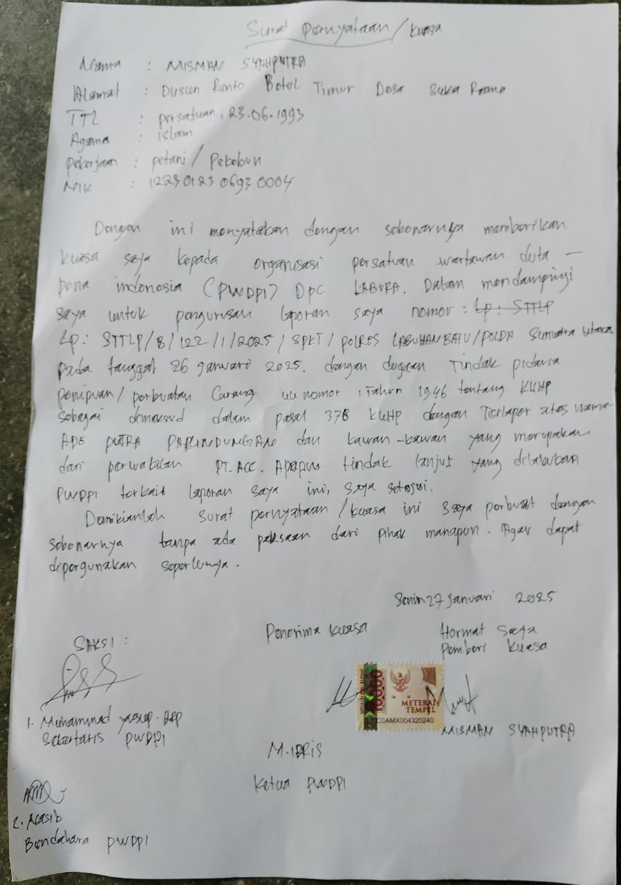 Merasa tertipu MS (31Thn) warga Dusun Ranto Betul Timur Desa Suka Rame Kecamatan Kualuh Hulu Kabupaten Labuhanbatu Utara Sumatera Utara, didampingi Sekertaris persatuan wartawan duta pena Indonesia (PWDPI) Dewan pimpinan cabang (DPC) Labuhanbatu Utara Muhammad Yusup Harahap melaporkan perwakilan PT.ACC pendanaan Ade Putra Parlindungan dan kawan-kawan ke aparat penegak hukum (APH) polres labuhan Batu dengan Nomor:STTLP/B/122/1/2025/SPKT/POLRES LABUHANBATU/POLDA SUMATERA UTARA. Pada hari Minggu 26 Januari 2025 sekira pukul 13:43 wib.