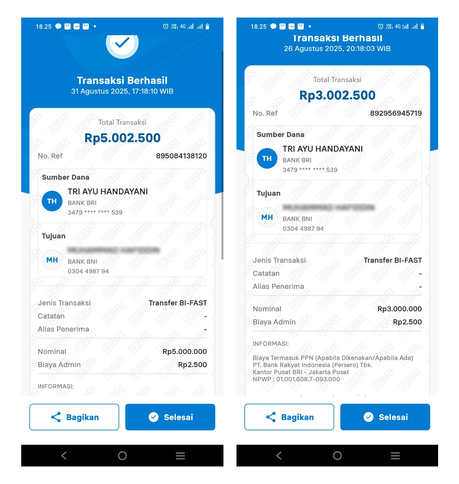Pembayaran dilakukan dua tahap: Rp 3 juta pada 26 Agustus 2025, dan Rp 5 juta pada 31 Agustus 2025, ditransfer langsung ke rekening MH.